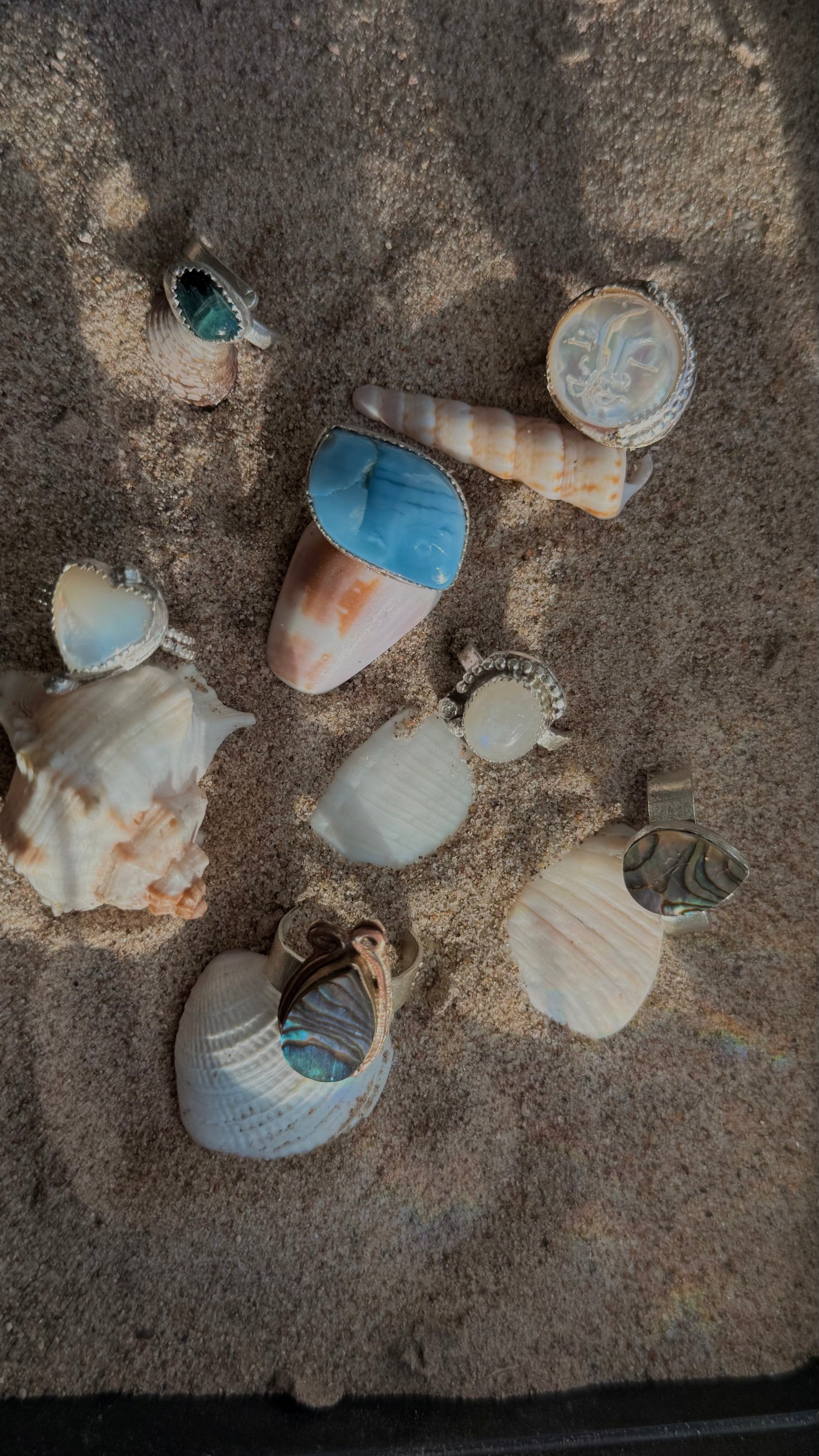 Tus Ojos y el Mar features a teardrop abalone shell set in a sterling silver bezel. The band is bold but light, crafted from silver over a copper base — unisex, minimal, and ocean-worn in spirit. The shifting greens, purples, and blues of the shell echo tidepools, secrets, and departures.